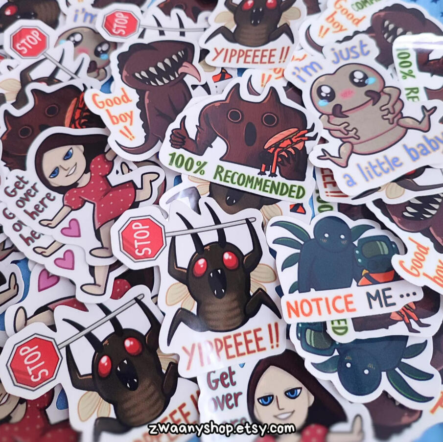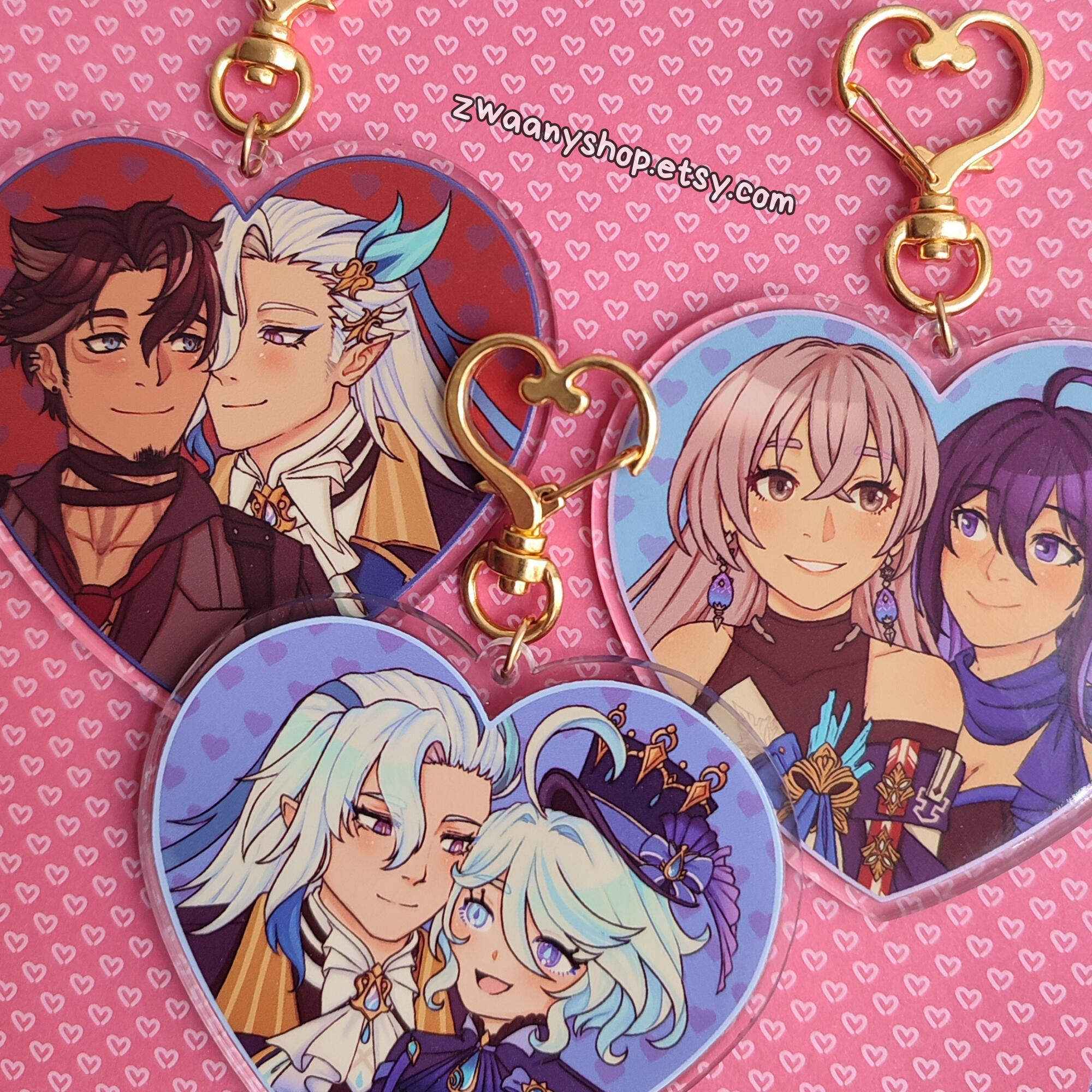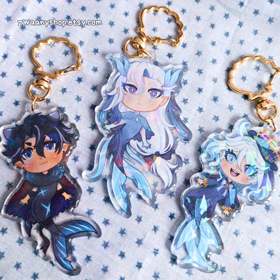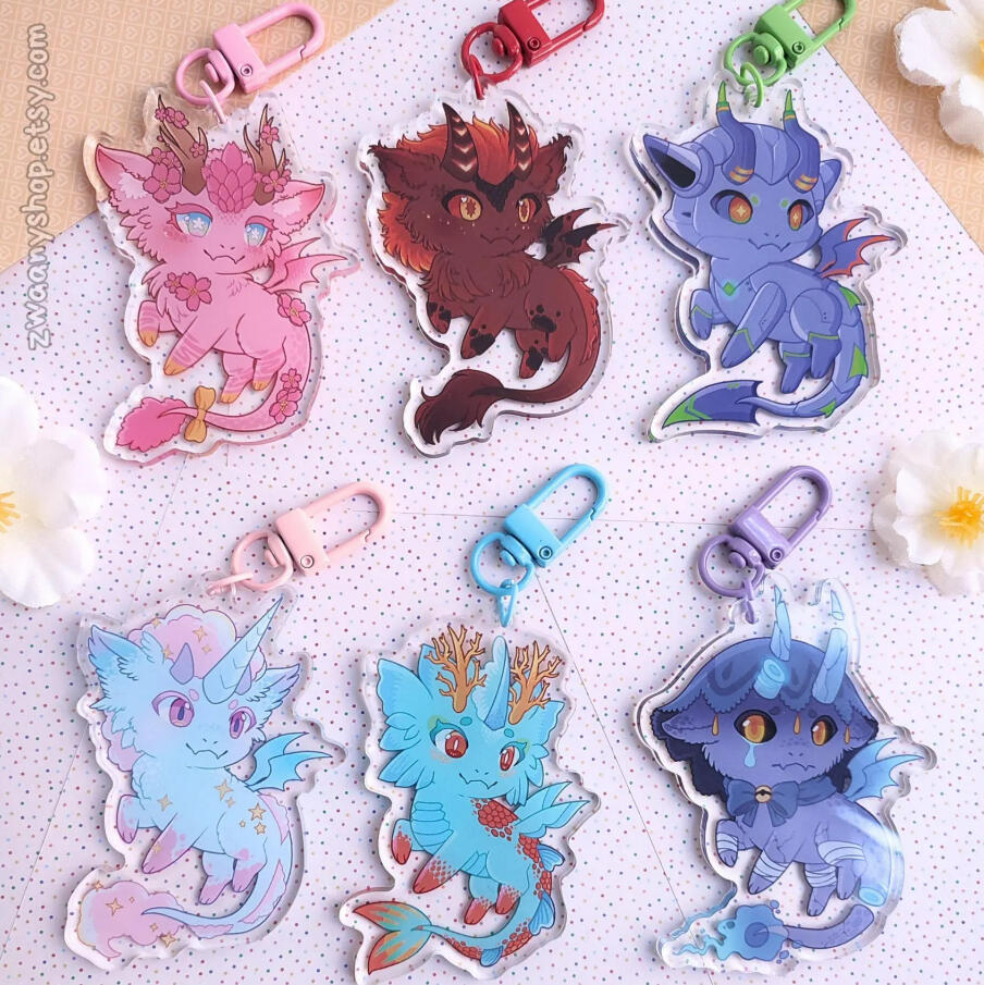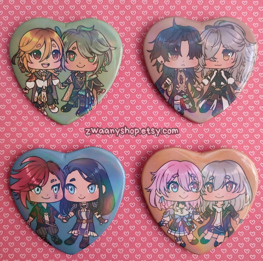 Various badges, acrylic keychains and stickers I made for my etsy shop!